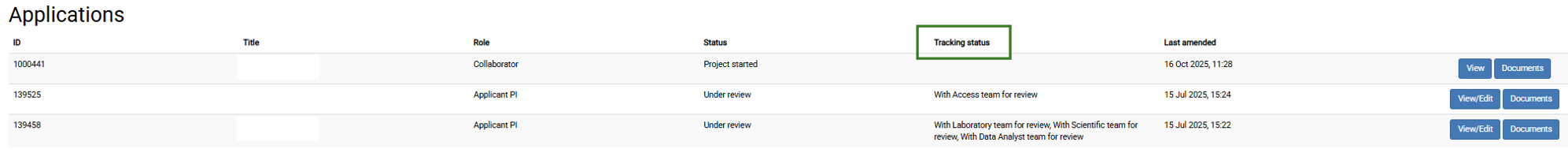 You can check the status of your application in the Tracking column on the applications listing in your profile: